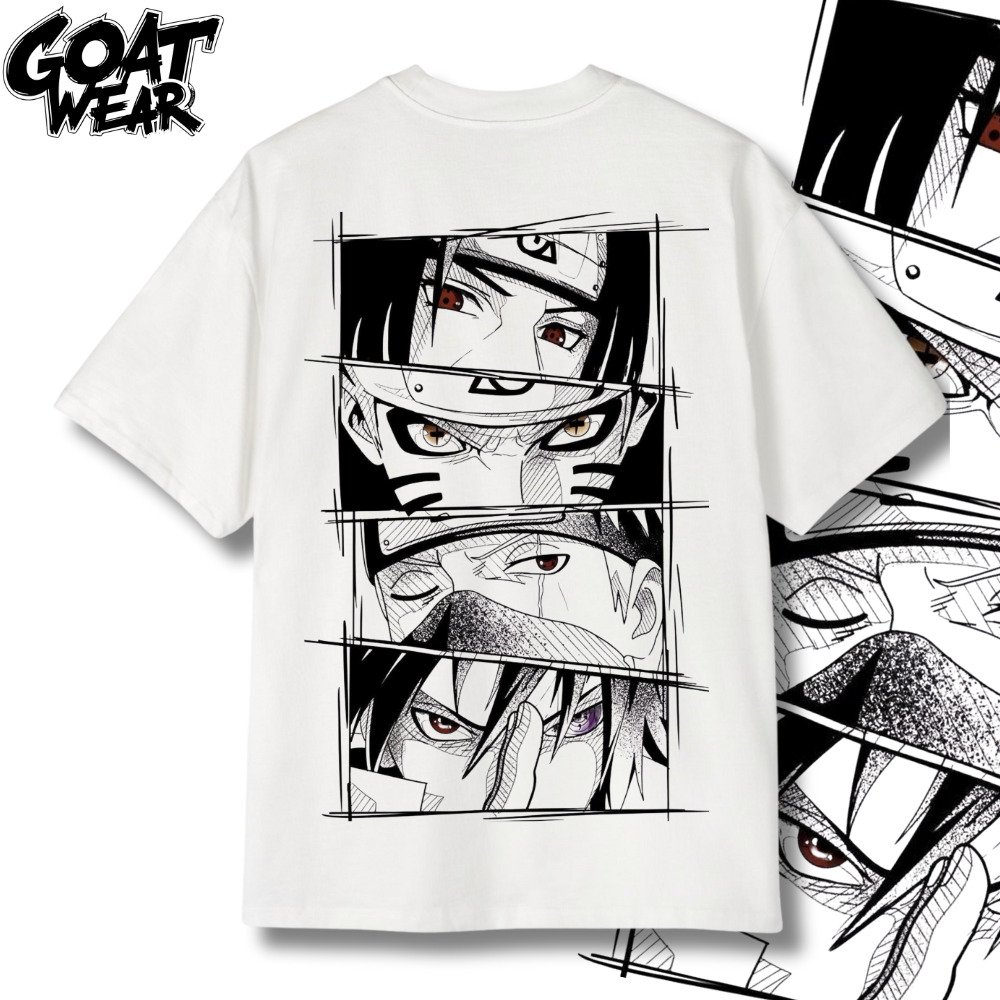 - Design Iconique : Le dos du t-shirt présente quatre panneaux verticaux, chacun montrant les yeux d’un personnage célèbre : Itachi Uchiha avec son Sharingan, Gaara avec ses marques de sable, Kakashi Hatake avec son Sharingan, et Sasuke Uchiha avec son Mangekyō Sharingan.